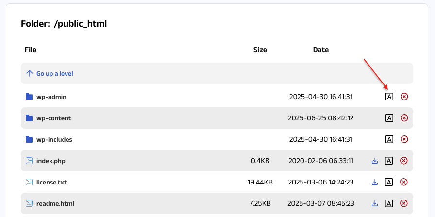 From the File Manager page, locate the file or folder you want to rename, then click the “A” icon next to it.
