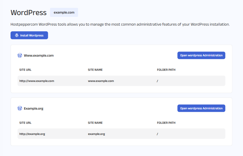 If WordPress has not been set up yet, a message will appear indicating this, along with a “Install WordPress” button.