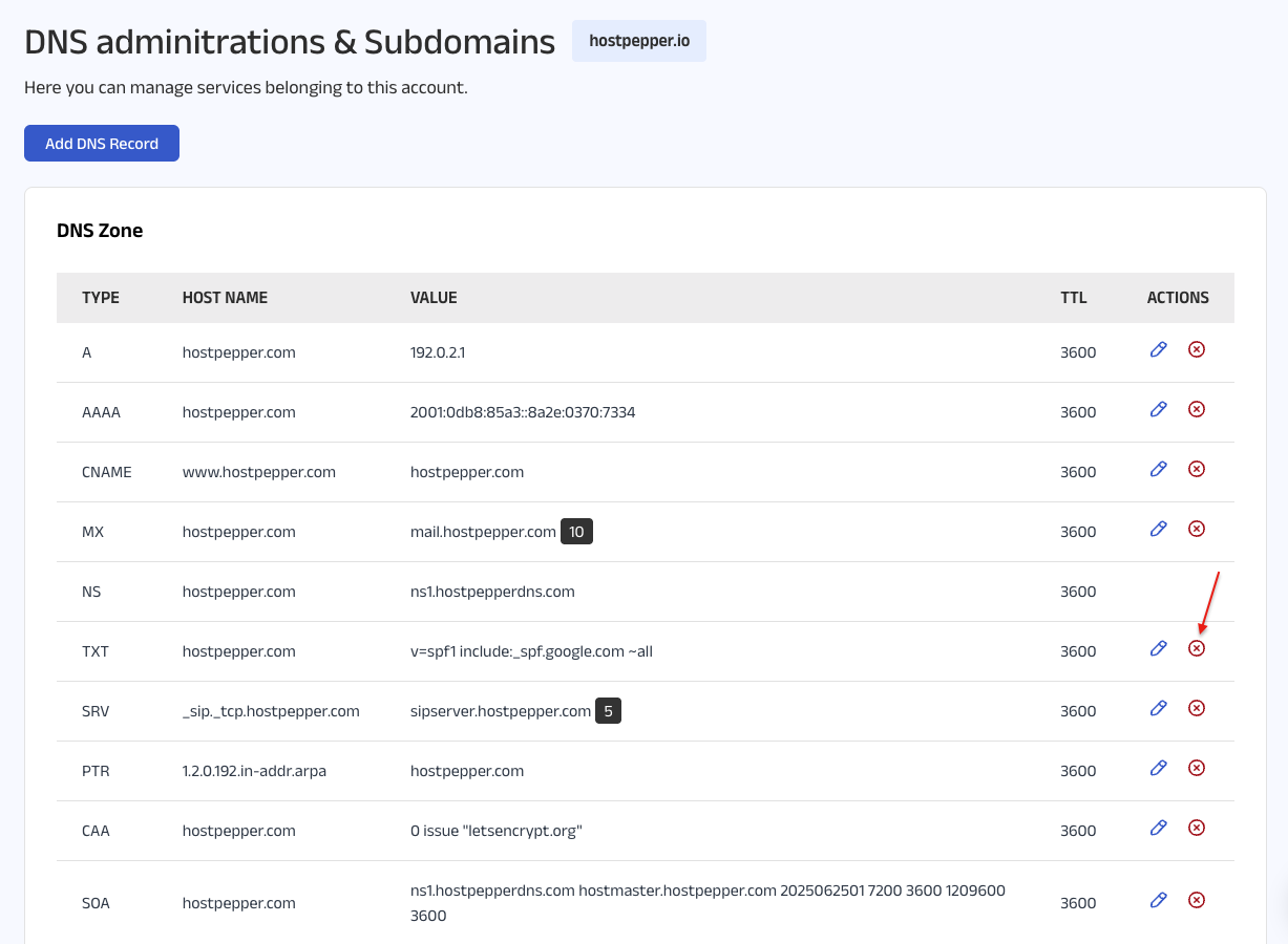 Click the delete (X) icon next to the DNS record you want to remove. A confirmation pop-up will appear asking, “Are you sure you want to delete this DNS record?”