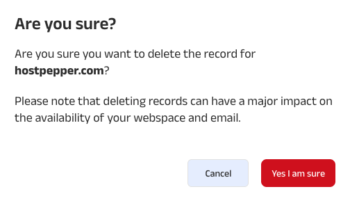 Click “Yes, I am sure” to confirm and delete the DNS record, or click Cancel if you change your mind.