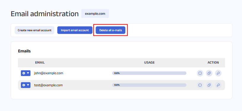 On the Email Administration page, click the “Delete All E-mails” button located next to the “Import Email Account” button.