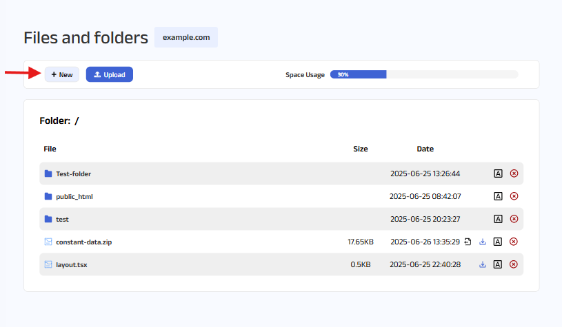 Once you're on the File Manager page, click on the “New” button in the top-left corner.