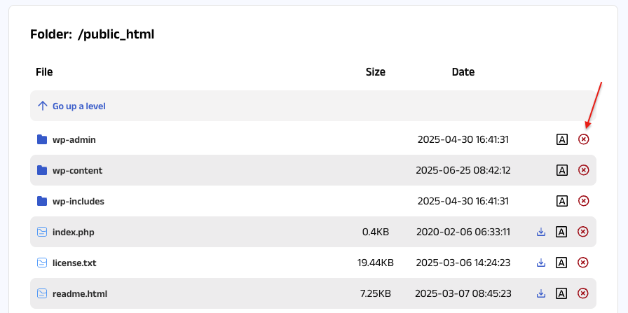 Once you're on the File Manager page, click the “X” icon next to the file or folder you want to delete.