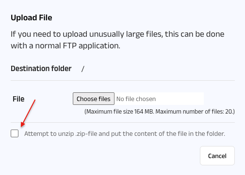 Select the checkbox, then click “Upload” to automatically unzip the ZIP file during the upload process.