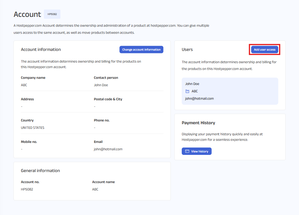 You’ll be redirected to the “Account” page, where you will see several sections including Account Information, General Information, Users, and Payment History.