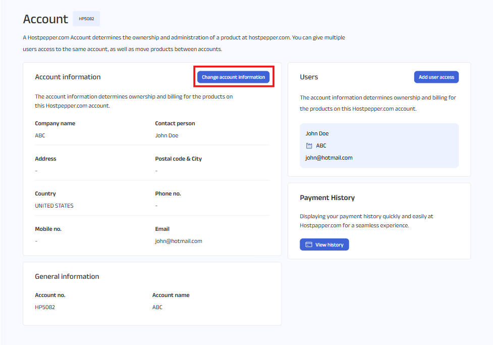 You’ll be redirected to the “Account” page, where you will see several sections including Account Information, General Information, Users, and Payment History.
