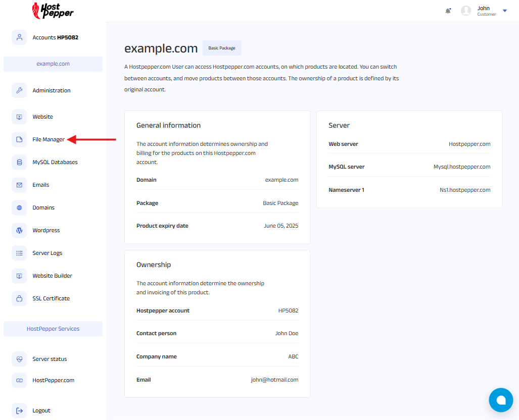 In the left sidebar, locate and click File Manager. This tool lets you browse and manage your website’s files directly.